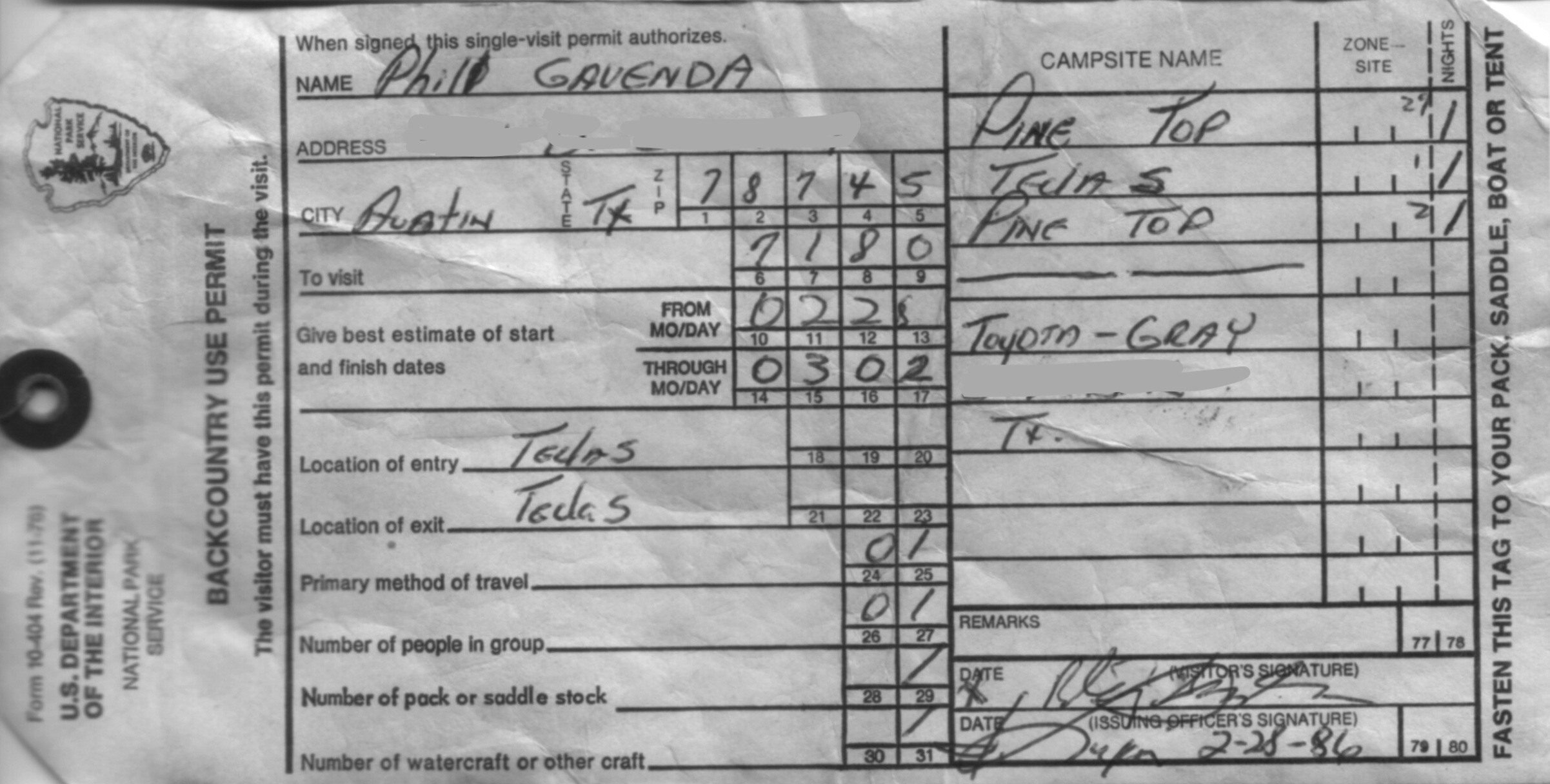 - 3/1/86 Tejas backcountry site