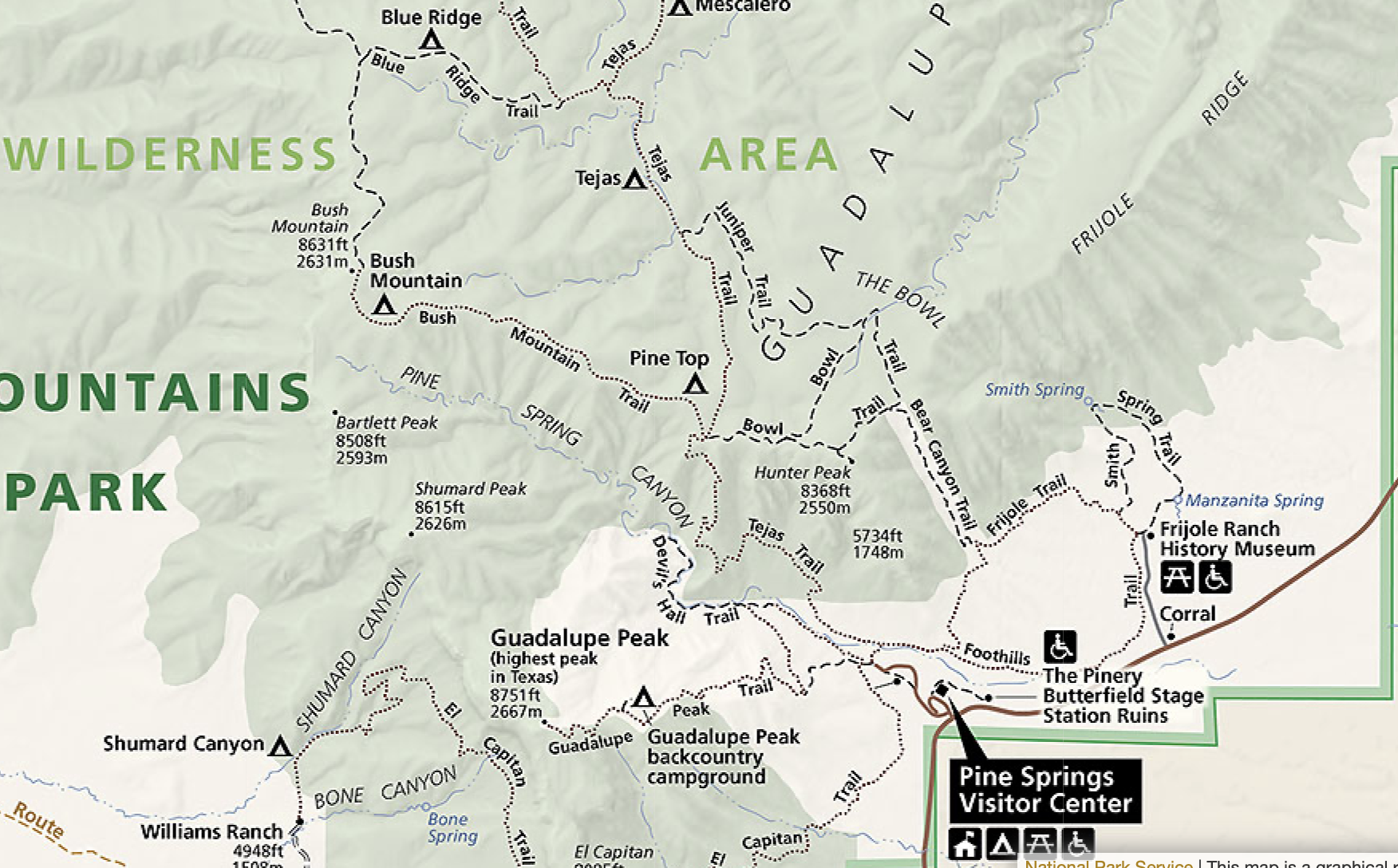 The next morning it was bright and sunny as I returned down the Tejas trail to the trailhead. The photos of Pine Springs Canyon which show the campground, maybe the old Glover store, and the development (or lack thereof) of the NPS residential area are somewhat interesting when compared to today. I rested a bit after arriving back at the nearly deserted trailhead, then departed the park, stopping to shoot a few photos from the El Capitan viewing area.