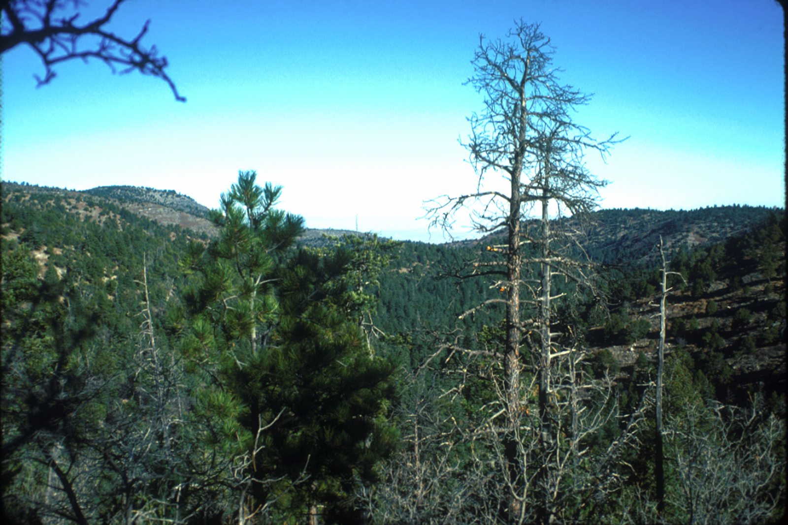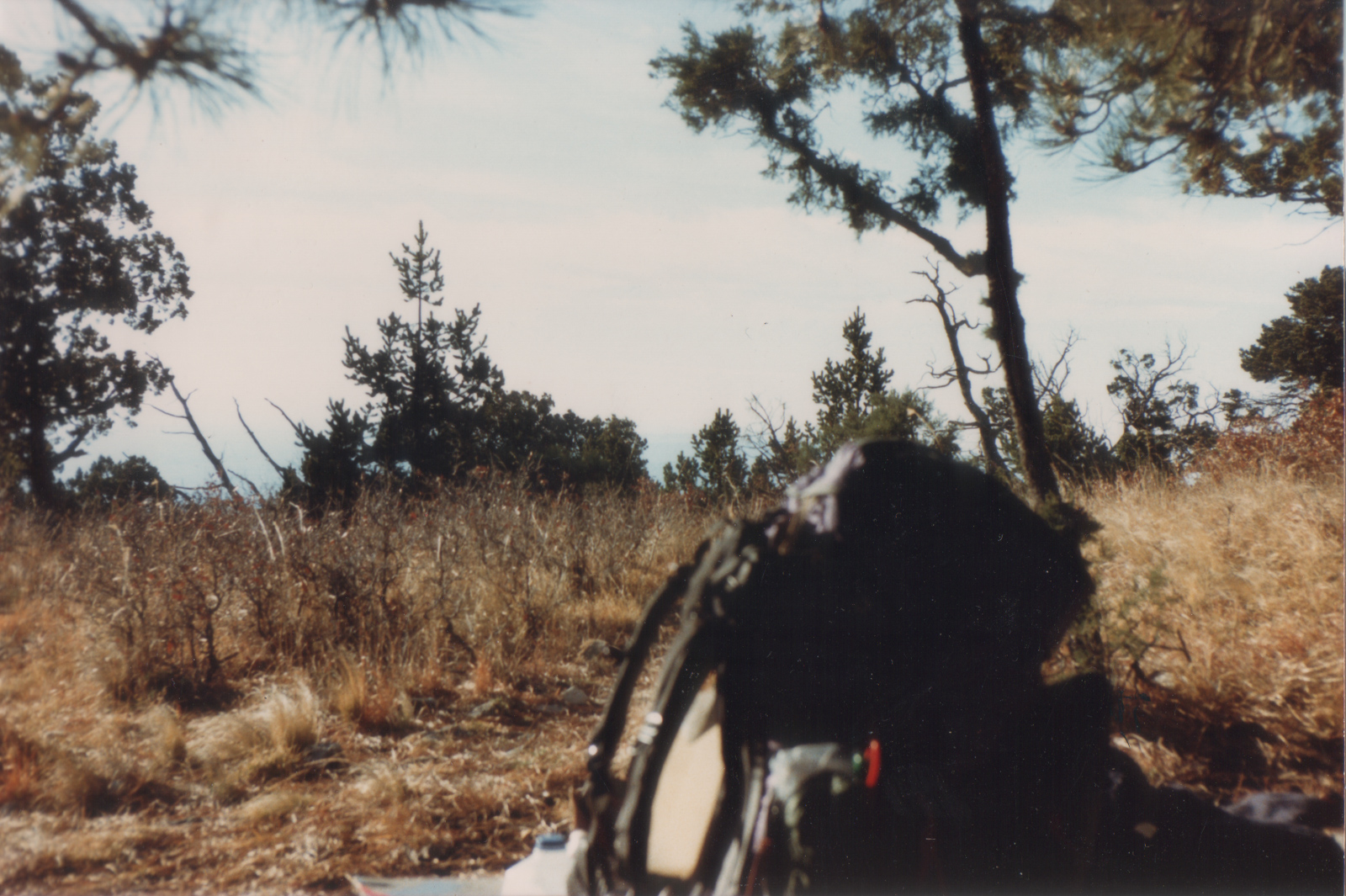 That night I spent some time experimenting with night photography; I succeeded in getting some photos of stars, but very unimpressive results compared to the easy captures of much better pictures today with my iPhone. The next morning I returned via the Tejas trail to the Pine Top site (which I found correctly this time). It was odd, apparently under some construction or something–one had to sleep on top of plywood platforms which was strange. Anyway I explored along the Bush Mountain trail for a while; it was overcast and not particularly scenic that day.