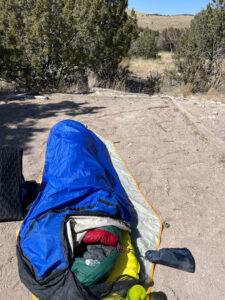 OR Advanced Bivy, old and heavy ground sheet, TNF Superlight Long bag. All over 20 years old. The yellow is a brand new Thermarest NeoAir XLite sleeping pad. Incredibly lightweight.